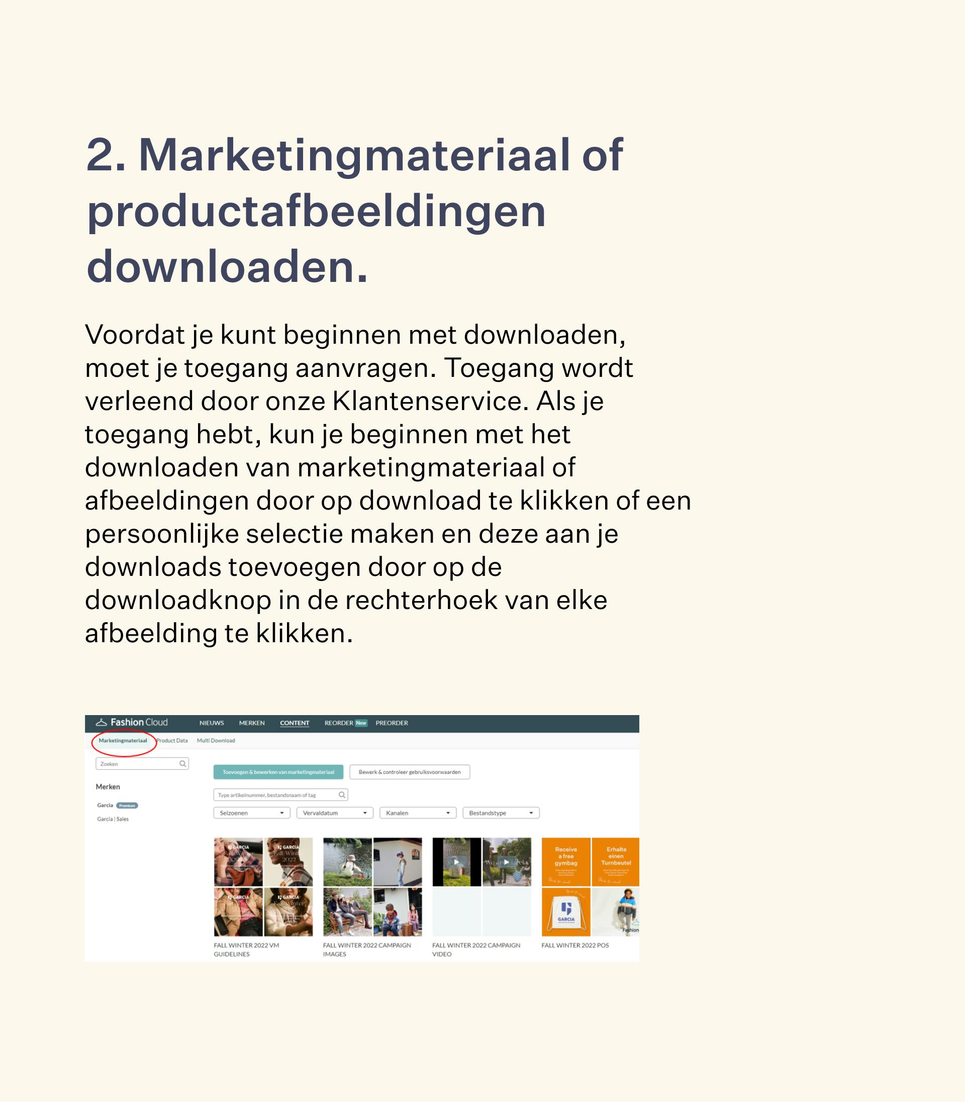 Fashion Cloud is een heel eenvoudig en gebruiksvriendelijk platform waar veel merken hun content aanbieden. Het voordeel is dat je maar één platform hoeft te gebruiken om content van verschillende merken te vinden. Het is een goed gestructureerde en duidelijke website, waar je het benodigde marketingmateriaal en productgegevens kunt vinden.
