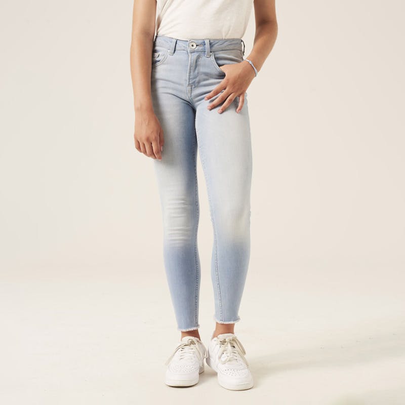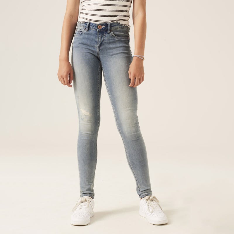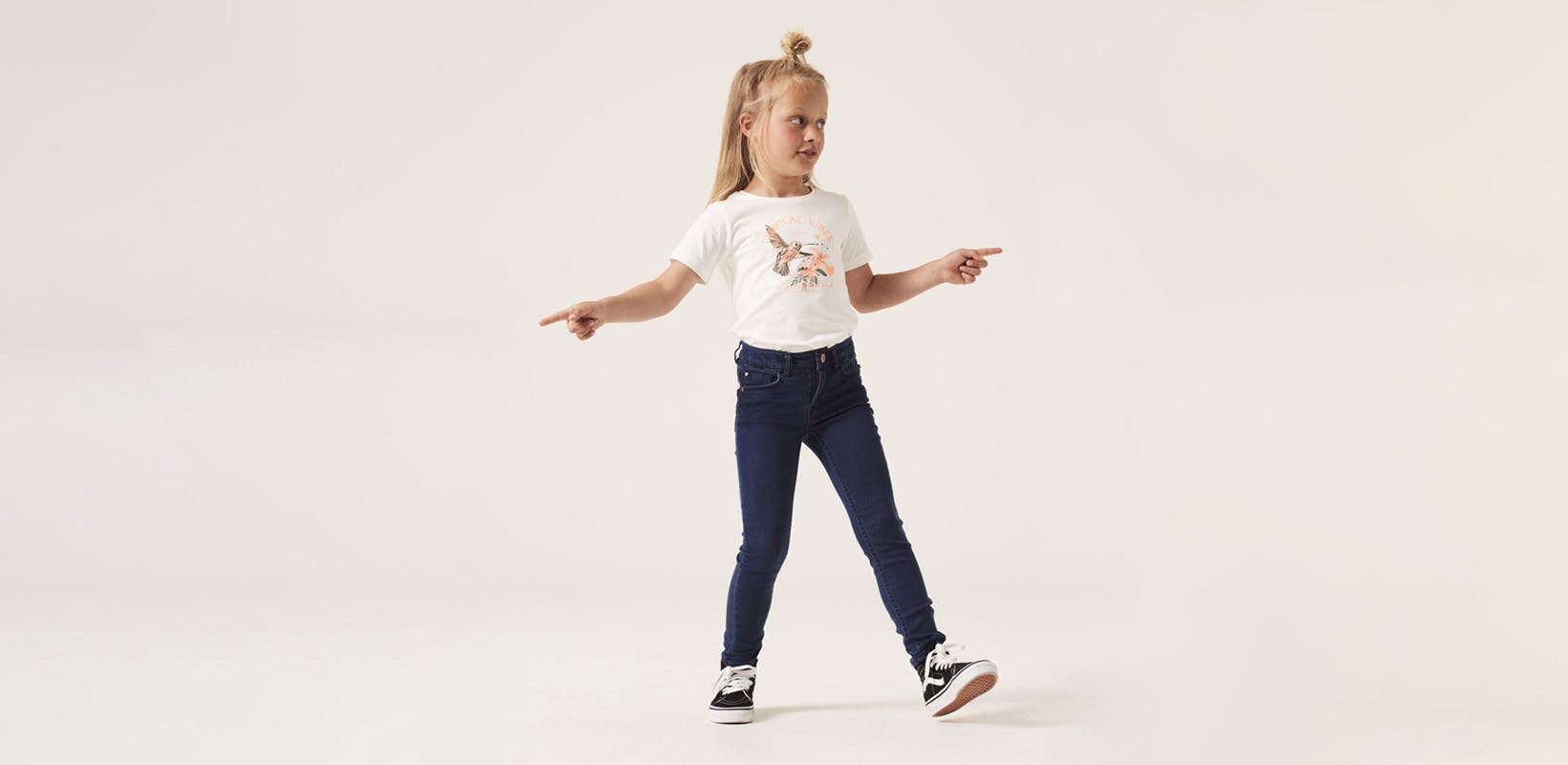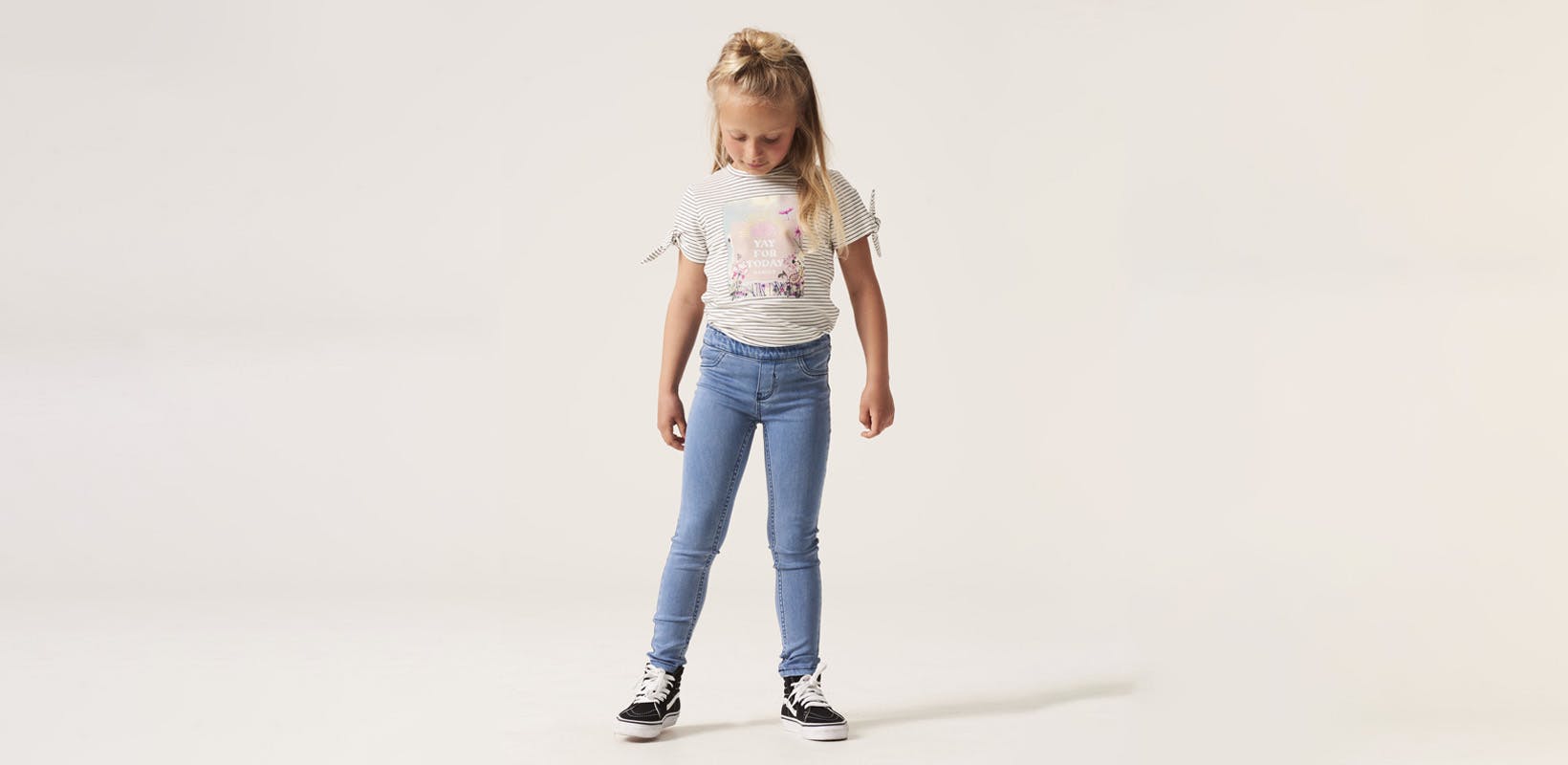 The Sanna 590 is a jeans with a super slim fit and a medium-high waist. Thanks to the stretch in the fabric, your little girl has enough freedom of movement in these jeans. The jeans closes with a zipper and button closure and has 5 pockets. You can easily adjust the width of the waist with the elastic bands on the inside.
