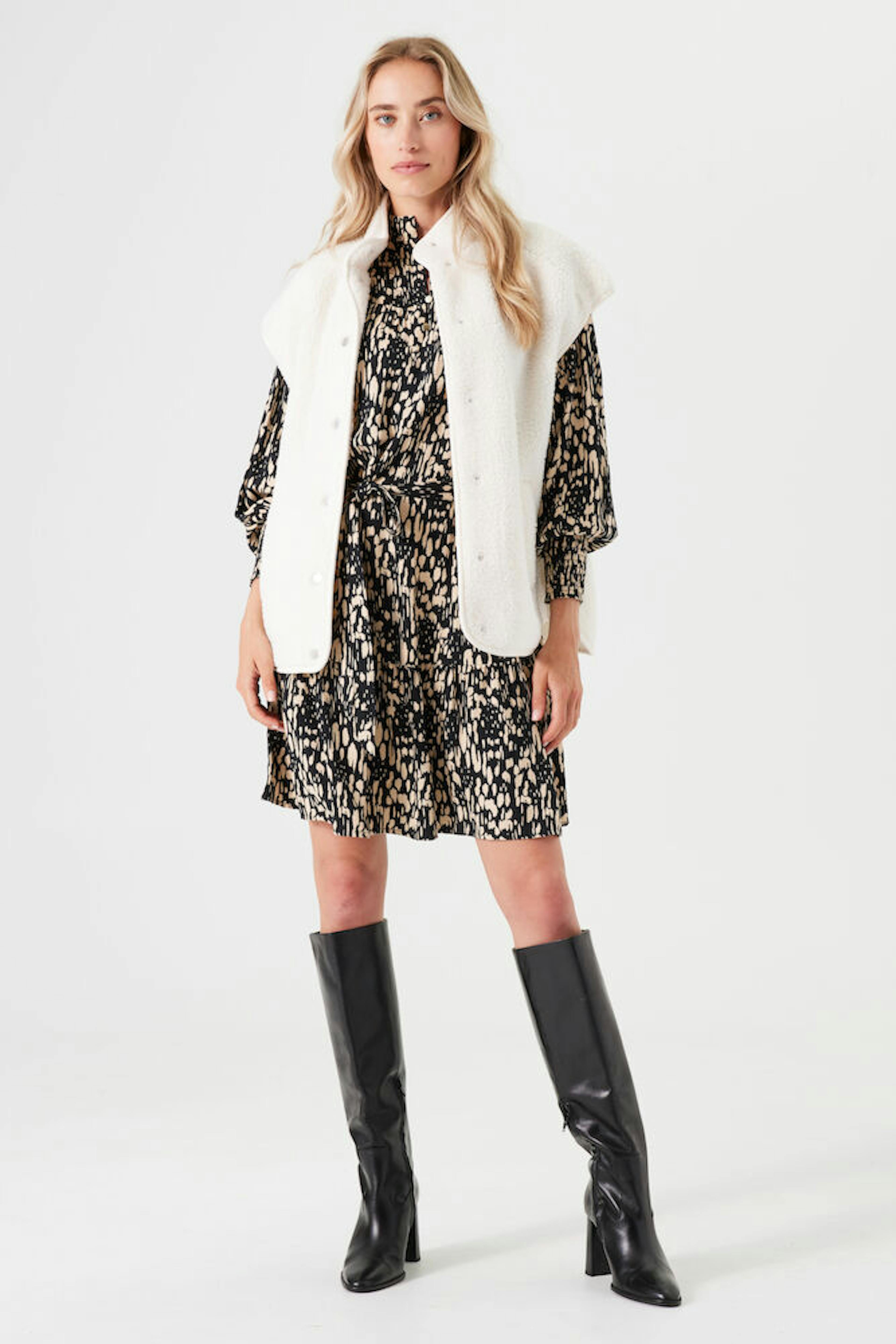 Speel met contrasten door je teddy gilet te combineren met stukken in verschillende texturen en materialen. Denk aan een zijden blouse onder een lange teddy gilet zwart of een gebreide jurk met een kort teddy gilet beige eroverheen. Dit voegt diepte en interesse toe aan je outfit