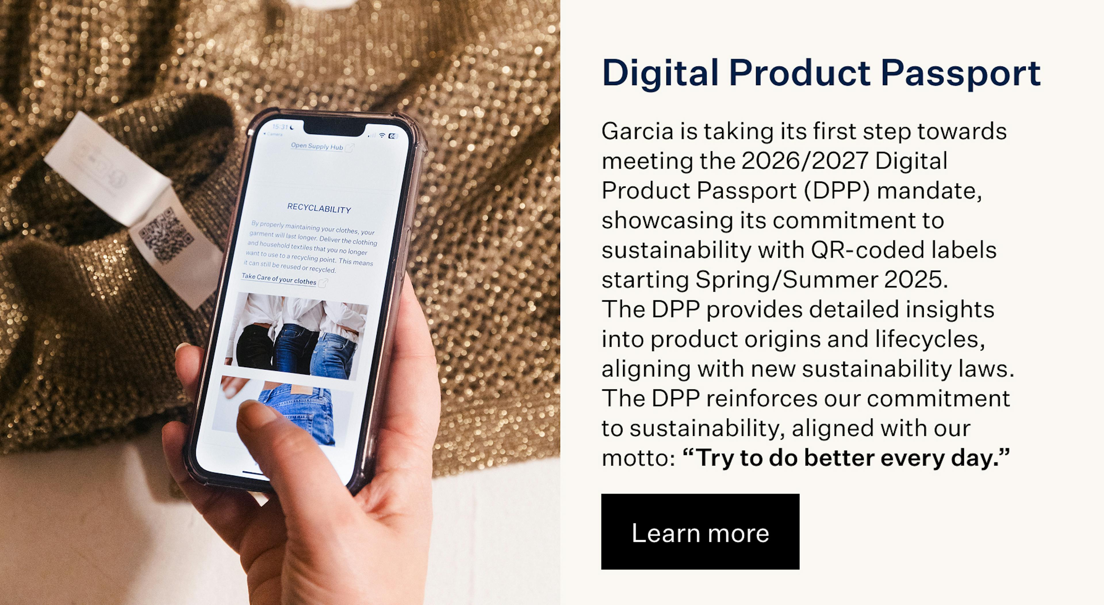 We are Garcia, a jeanswear brand that brings people together and builds connections that go beyond borders and genetic codes. We dress families, and like any family, we’re not perfect. But every day, we strive to do better. From the way we design our collections to the choices we make for the future, we are committed to continuous improvement, especially when it comes to sustainability. While others may refer to corporate social responsibility, we see it as an extension of our family values, because caring for each other and our environment is at the heart of everything we do. We believe life is better together.