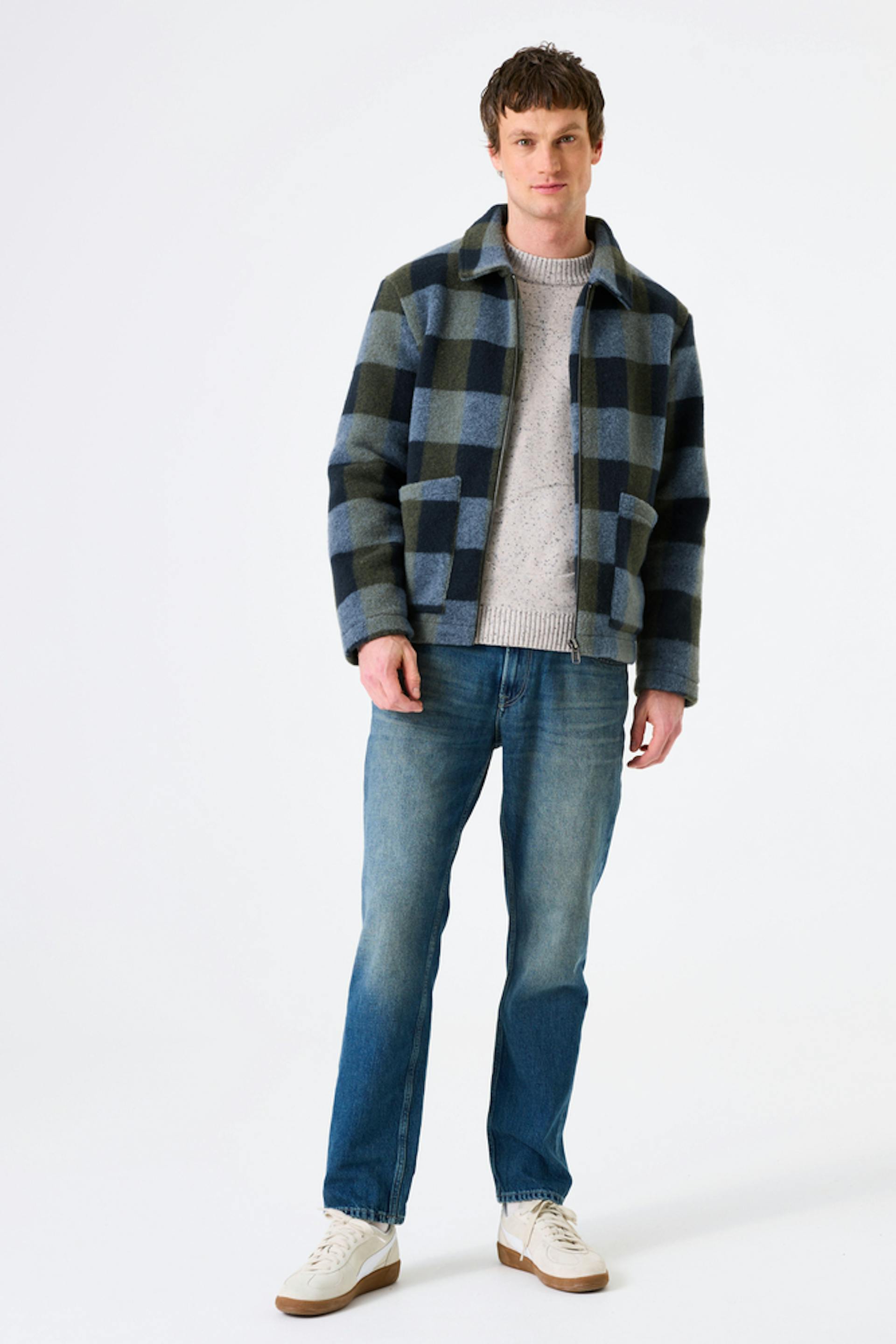 Deze look combineert klassiek comfort met een moderne twist. De geruite jas in blauw- en groentinten voegt direct karakter toe aan de outfit en vormt een stoer statement zonder schreeuwerig te zijn. Daaronder zorgt een gemêleerde trui voor een zachte, neutrale basis, perfect in balans met de tijdloze, licht vervaagde jeans. Witte sneakers houden het geheel fris en casual. Een ideale everyday look voor frisse dagen — relaxed, moeiteloos en stijlvol zonder te overdrijven.