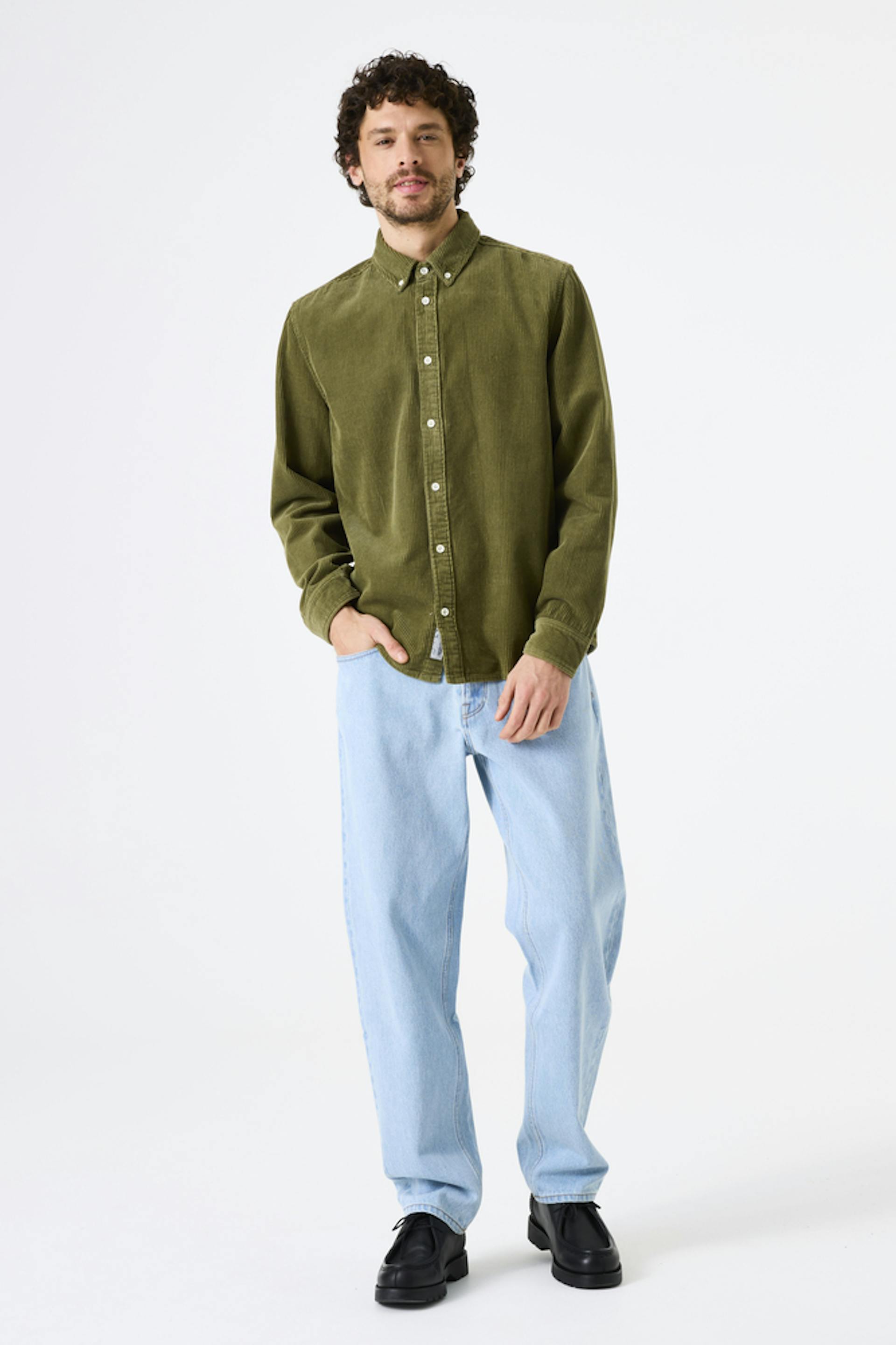 Deze look straalt een relaxte, eigentijdse vibe uit met een subtiele knipoog naar klassiek comfort. Het olijfgroene corduroy overhemd voegt structuur en diepte toe, en staat prachtig in contrast met de lichtblauwe, losvallende jeans. De zwarte leren schoenen geven het geheel een stijlvolle, iets nettere finish — perfect voor wie casual wil gaan zonder in te leveren op uitstraling. Deze outfit is ideaal voor een casual workday, een weekendwandeling of een koffiedate in de stad.