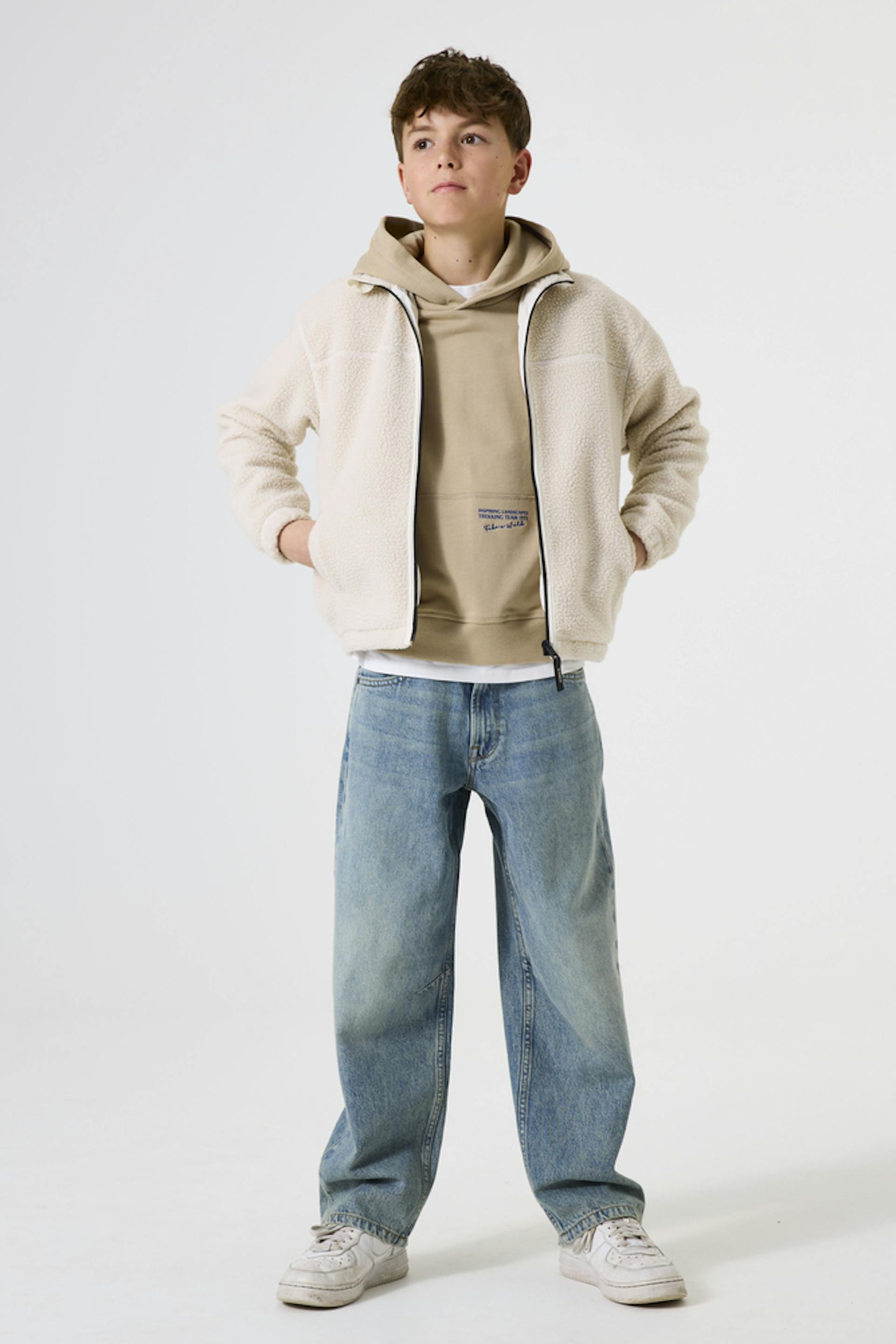 Deze outfit is het toonbeeld van comfortabele coolness met een moderne twist. De zandkleurige hoodie vormt de perfecte basislaag, terwijl het zachte teddyjack in offwhite een cozy en eigentijdse uitstraling toevoegt. De lichtblauwe jeans met losse pasvorm geeft de look een relaxte vibe, perfect in balans met de chunky witte sneakers. Deze combinatie is ideaal voor frisse dagen waarop je stijlvol en warm voor de dag wilt komen, of je nu de stad in gaat of gewoon buiten rondhangt met vrienden.