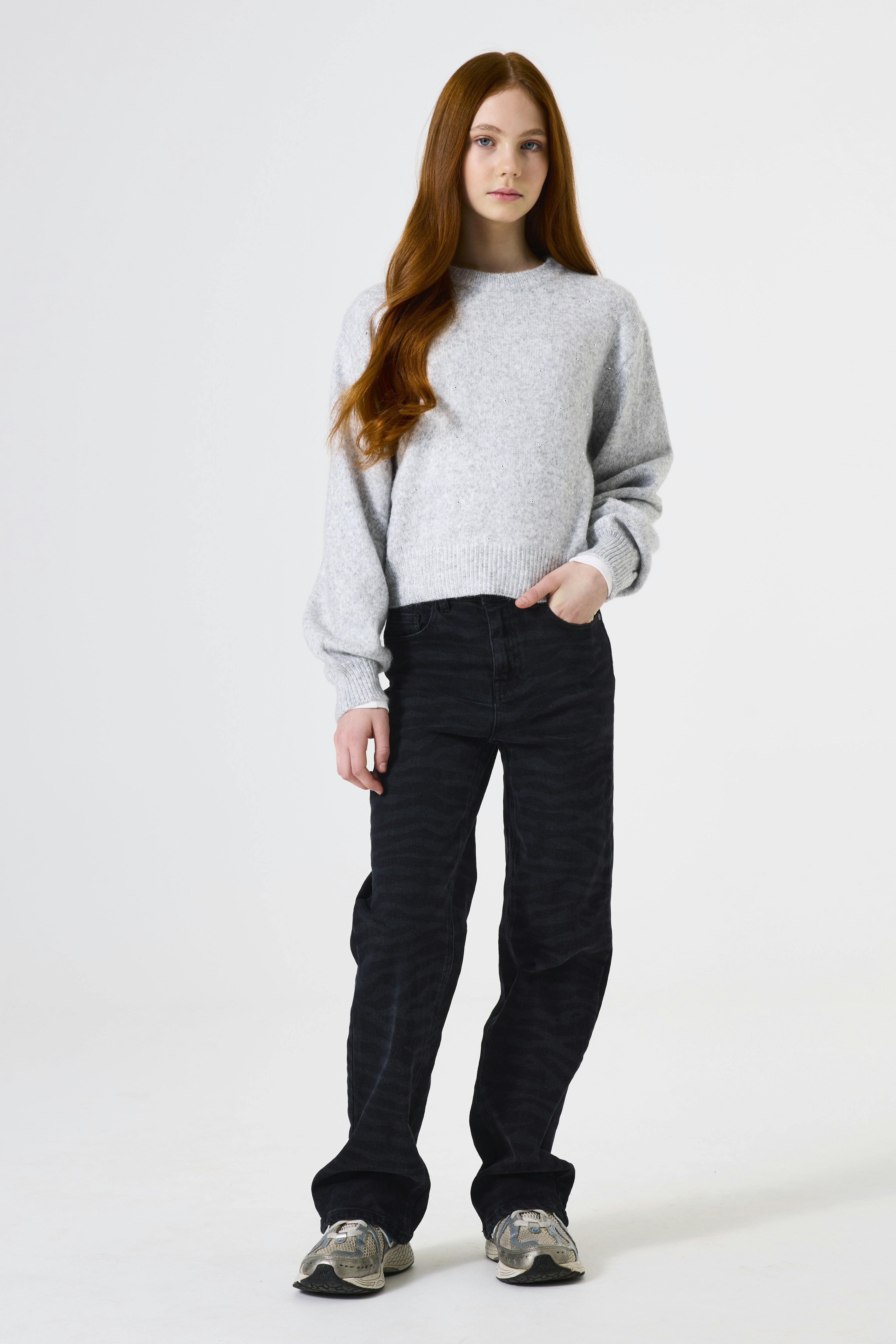 Deze look combineert zachte knitwear met een streetwear twist. De lichtgrijze, fluffy trui heeft een comfortabele, relaxte pasvorm en voelt heerlijk zacht aan — perfect voor frisse dagen. De donkerblauwe broek met subtiel zebrapatroon voegt een speels en stoer accent toe, terwijl chunky sneakers de outfit een sportieve finish geven. Deze look is ideaal voor schooldagen, chillen met vrienden of elke dag waarop je stijl en comfort wil combineren zonder moeite.